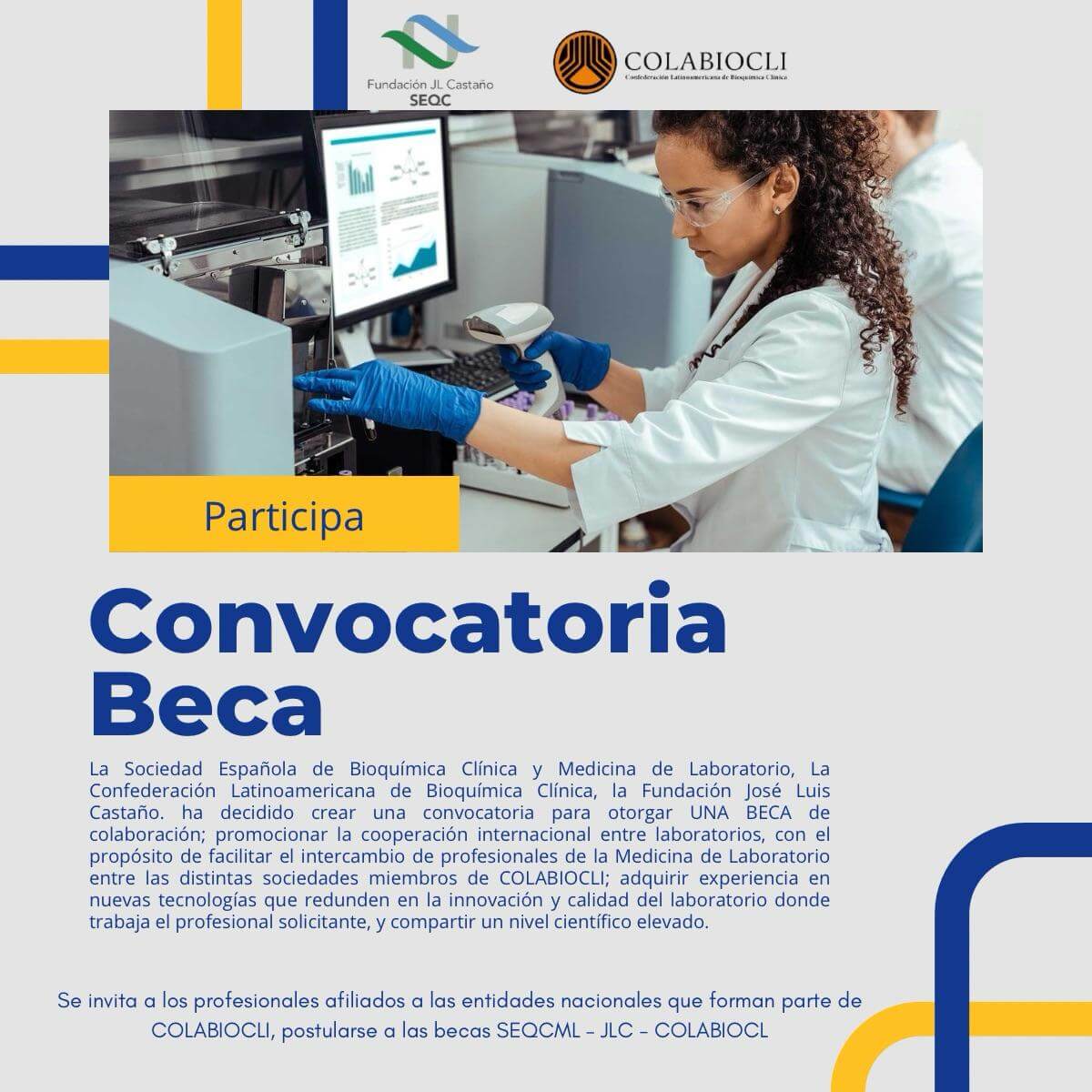 En el marco del acuerdo de colaboración entre La Sociedad Española de Bioquímica Clínica y Medicina de Laboratorio (SEQC-ML) y La Confederación Latinoamericana de Bioquímica Clínica (COLABIOCLI), la Fundación José Luis Castaño (JLC)-SEQCML ha decidido crear una convocatoria para otorgar una beca de colaboración; promocionar la cooperación internacional entre laboratorios, con el propósito de facilitar el intercambio de profesionales de la Medicina de Laboratorio entre las distintas sociedades miembros de COLABIOCLI; adquirir experiencia en nuevas tecnologías que redunden en la innovación y calidad del laboratorio donde trabaja el profesional solicitante, y compartir un nivel científico elevado.